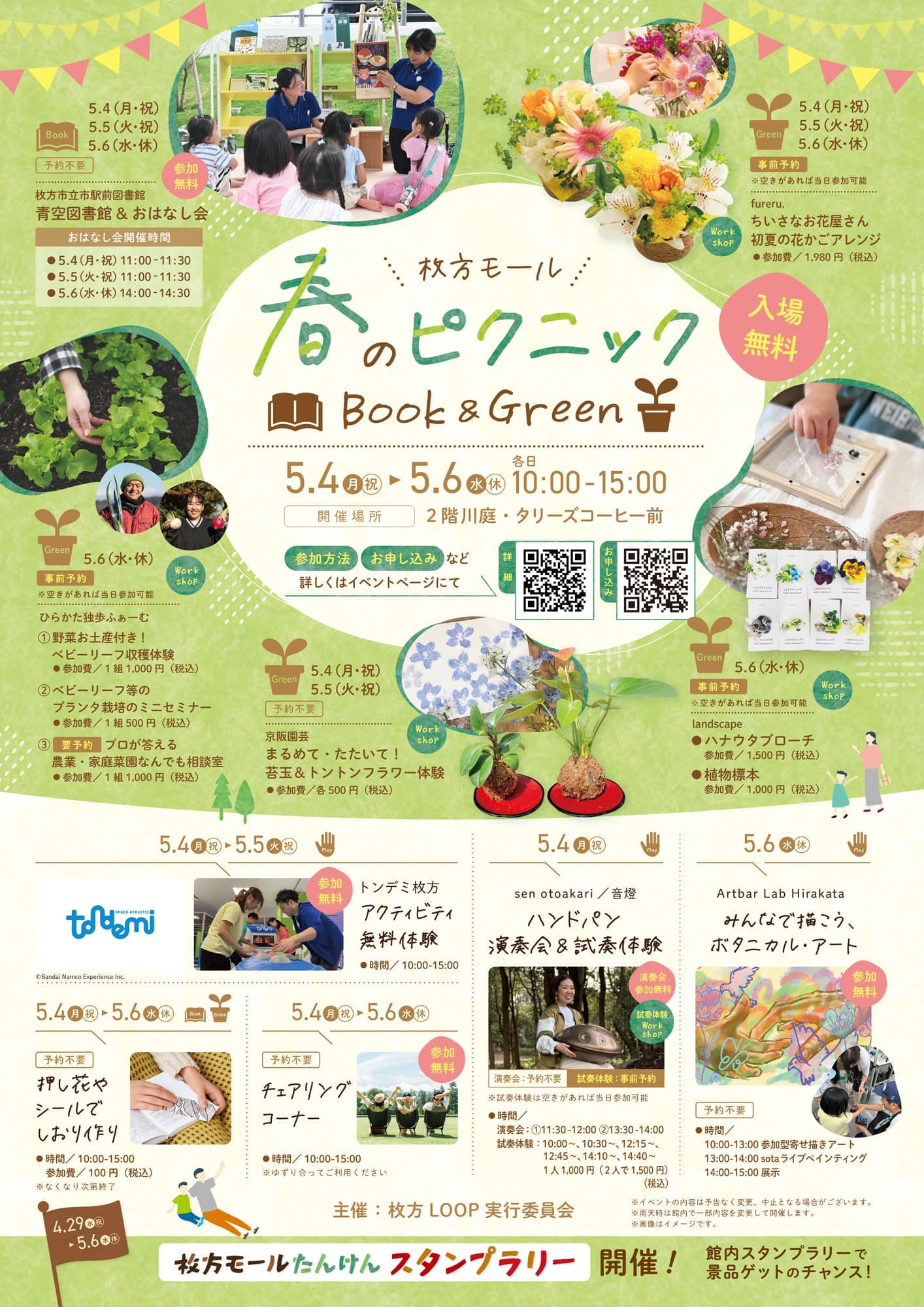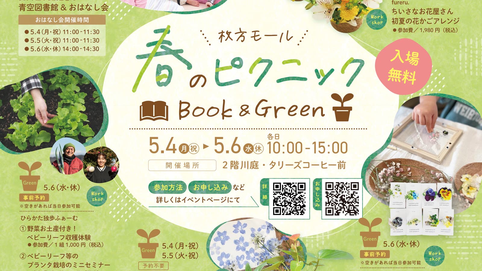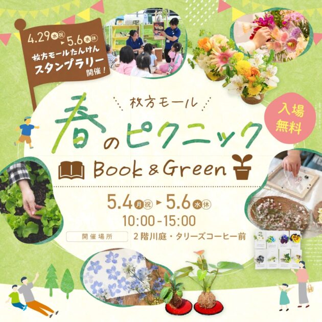 2026年5月4日(月・祝)〜6日(水・休)の3日間10:00〜15:00まで、枚方市駅直結の枚方モール2階の川庭(タリーズコーヒー前)にて「春のピクニックBook&Green」が開催されます。開放的な空間で、のんびり過ごしながら、学びや体験が楽しめるGWにぴったりの企画です。
